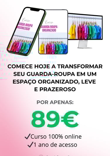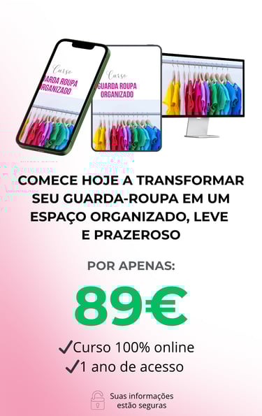 O curso é 100% online, com aulas passo a passo para organizar seu guarda-roupa de forma prática e duradoura. Inclui vídeos, checklists, guias visuais e materiais de apoio.