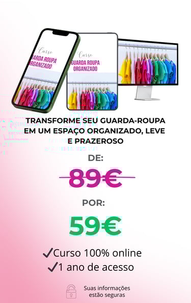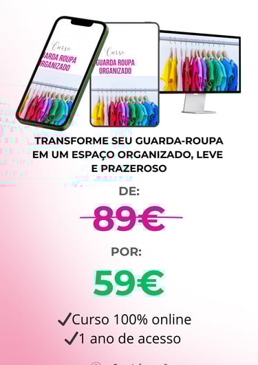 O curso é 100% online, com aulas passo a passo para organizar seu guarda-roupa de forma prática e duradoura. Inclui vídeos, checklists, guias visuais e materiais de apoio.